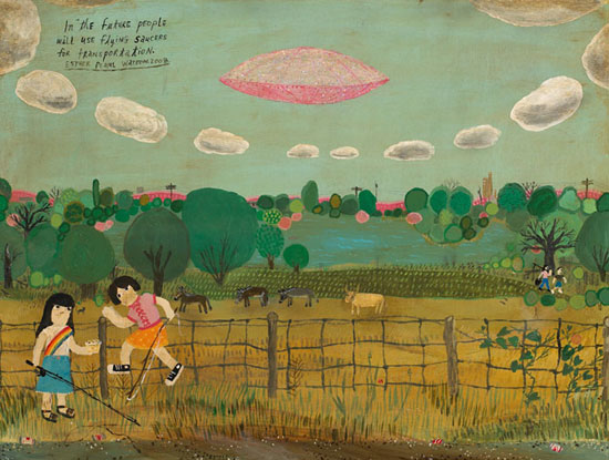 "In the Future People Will Use Flying Saucers for Transportation" Acrylic and Glitter on Panel 15" x 20" inches $1800