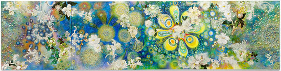 Time, Space, Cosmology and Life (2003 - 5) Acrylic Paint, Crystals, Pearls, Glitter, Collaged Paper and Mixed Media on Canvas 48" x 192" (4 panels)